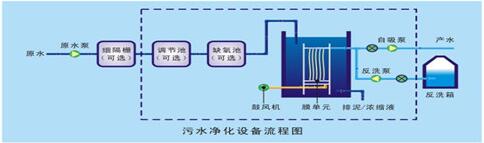 原水由經(jīng)細格柵后流入調(diào)節(jié)池中,在調(diào)節(jié)池中混合調(diào)節(jié)以后進入缺氧池,在缺氧池水解反應(yīng)后由提升泵將原水送入第四代膜生物反應(yīng)器,經(jīng)第四代膜生物反應(yīng)器后的產(chǎn)水經(jīng)紫外消毒設(shè)備,直接回用。