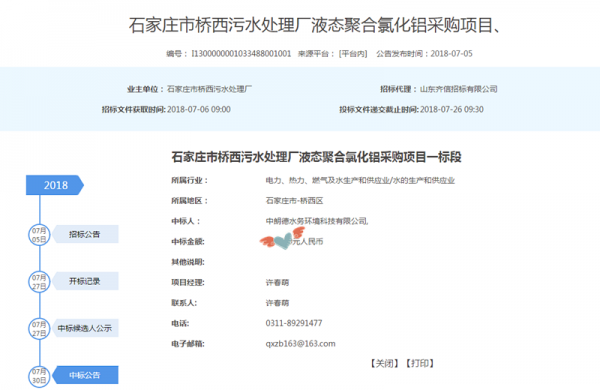 熱烈祝賀公司在《石家莊市橋西污水處理廠液態(tài)聚合氯化鋁采購項目》中標(biāo)!
