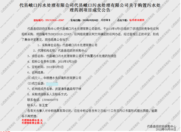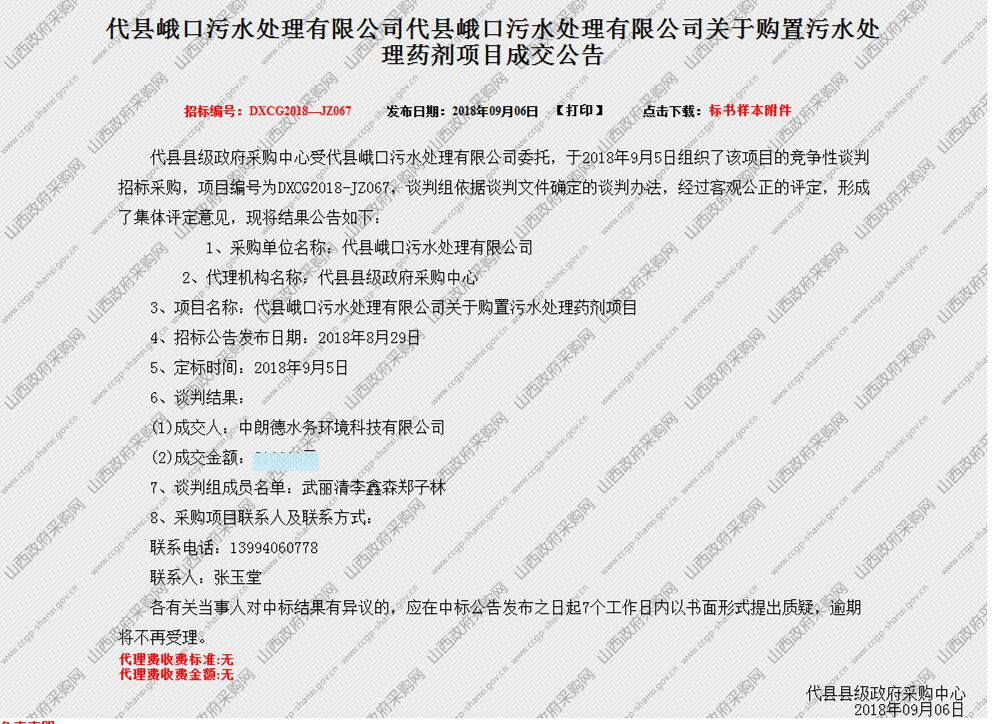 熱烈祝賀中朗德水務(wù)環(huán)境科技有限公司憑借科學(xué)的管理、雄厚的技術(shù)力量、優(yōu)質(zhì)的產(chǎn)品和良好的信譽(yù),于2018年9月5日順利中標(biāo)山西代縣峨口污水處理有限公司關(guān)于購(gòu)置污水處理藥劑項(xiàng)目!