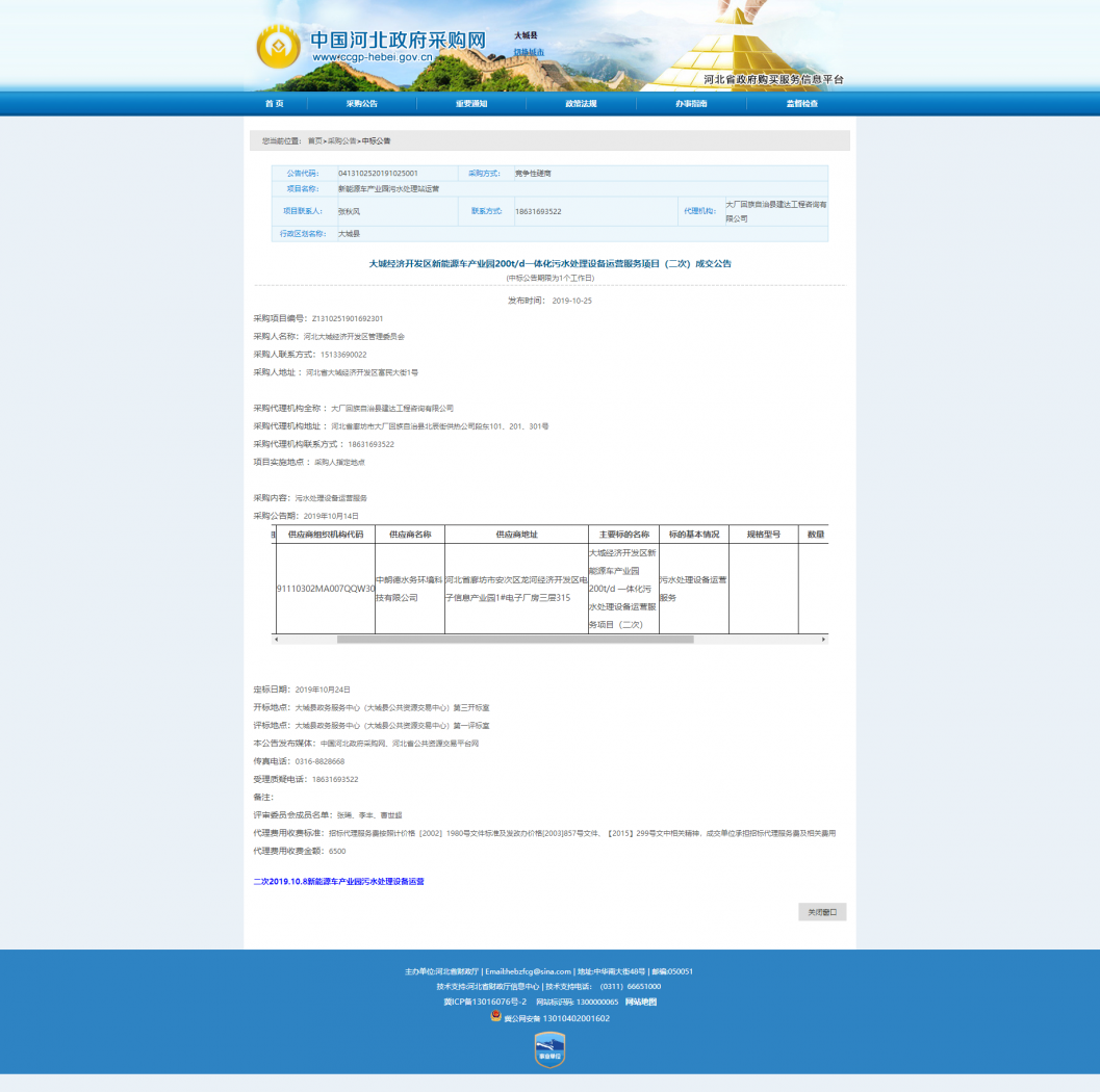 熱烈祝賀中朗德水務(wù)環(huán)境科技有限公司于2019年10月24日在河北廊坊“大城經(jīng)濟(jì)開發(fā)區(qū)新能源車產(chǎn)業(yè)園200t/d一體化污水處理設(shè)備運(yùn)營服務(wù)項(xiàng)目(二次)”的投標(biāo)活動(dòng)中,一舉中標(biāo)!