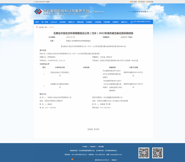 熱烈祝賀中朗德水務(wù)環(huán)境科技有限公司于2022年06月29日在石家莊水投生態(tài)環(huán)保有限責(zé)任公司(污水)2022年液態(tài)聚合氯化鋁采購(gòu)項(xiàng)目的投標(biāo)活動(dòng)中,一舉中標(biāo)!