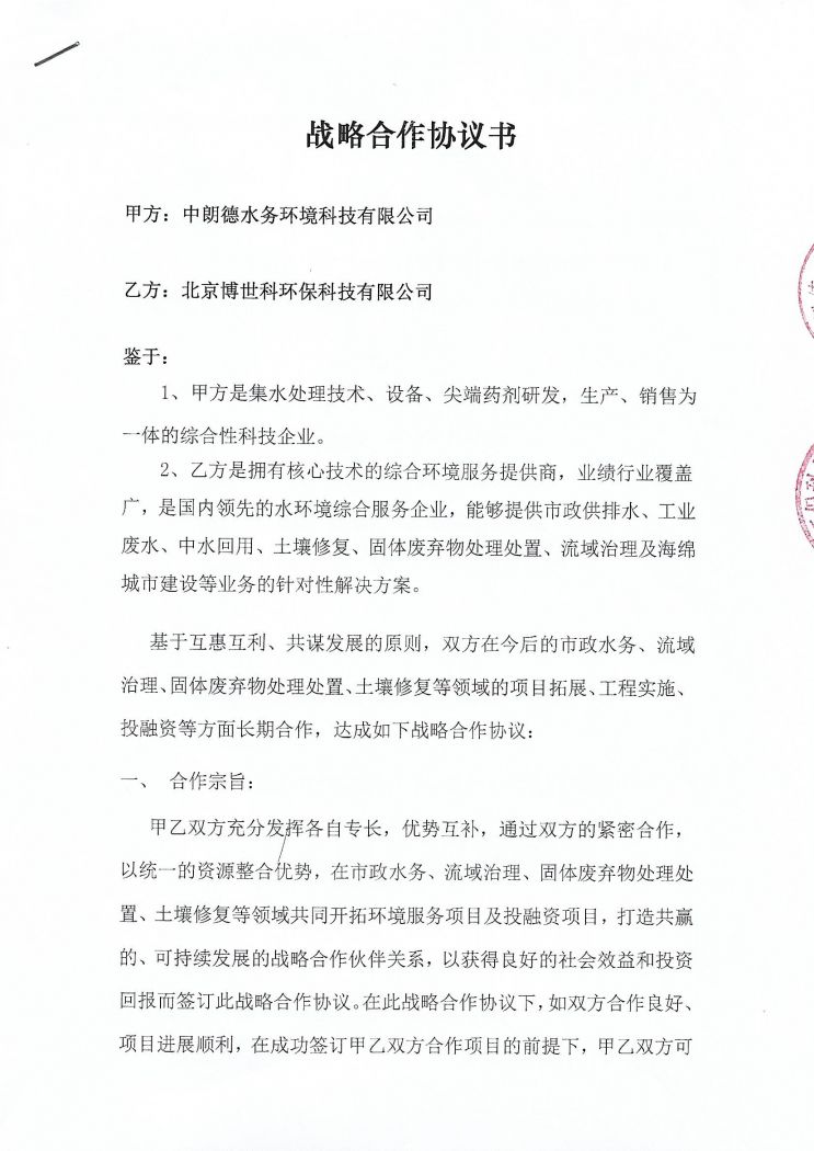 北京博世科環(huán)??萍加邢薰九c中朗德水務(wù)有限公司簽署戰(zhàn)略合作協(xié)議